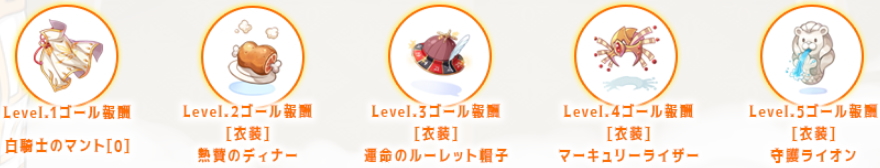 Lv1は無し。Lv2「白騎士のマント」。Lv3「[衣装]熱餐のディナー」。